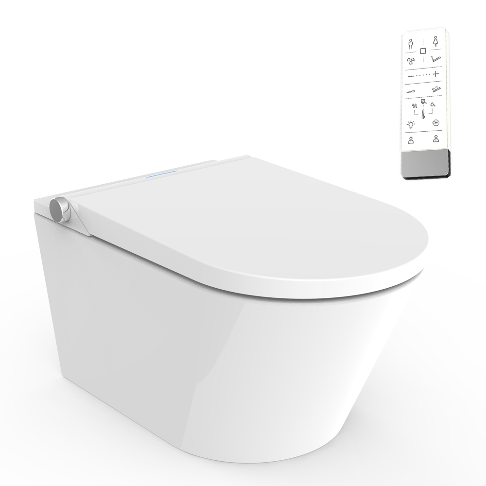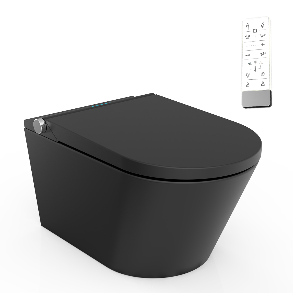 Bu Avrupa tarzı duvara monte akıllı klozet, şık minimalizmi üst düzey teknolojiyle birleştiriyor. Mat siyah kaplaması, modern banyolara uygun cesur bir zarafet katıyor. Klozet ve bide fonksiyonlarını bir araya getiriyor: çift kademeli sifon (su tasarruflu), ayarlanabilir bide püskürtme (sıcaklık/basınç), ısıtmalı klozet kapağı ve sıcak hava kurutucu. Duvara monte tasarımı yerden tasarruf sağlar ve temizliği kolaylaştırır. IPX4 su geçirmezlik özelliği ve antibakteriyel klozet kapağı güvenliği garanti eder. Avrupa esintili banyoları konfor ve stil ile zenginleştirmek için idealdir.